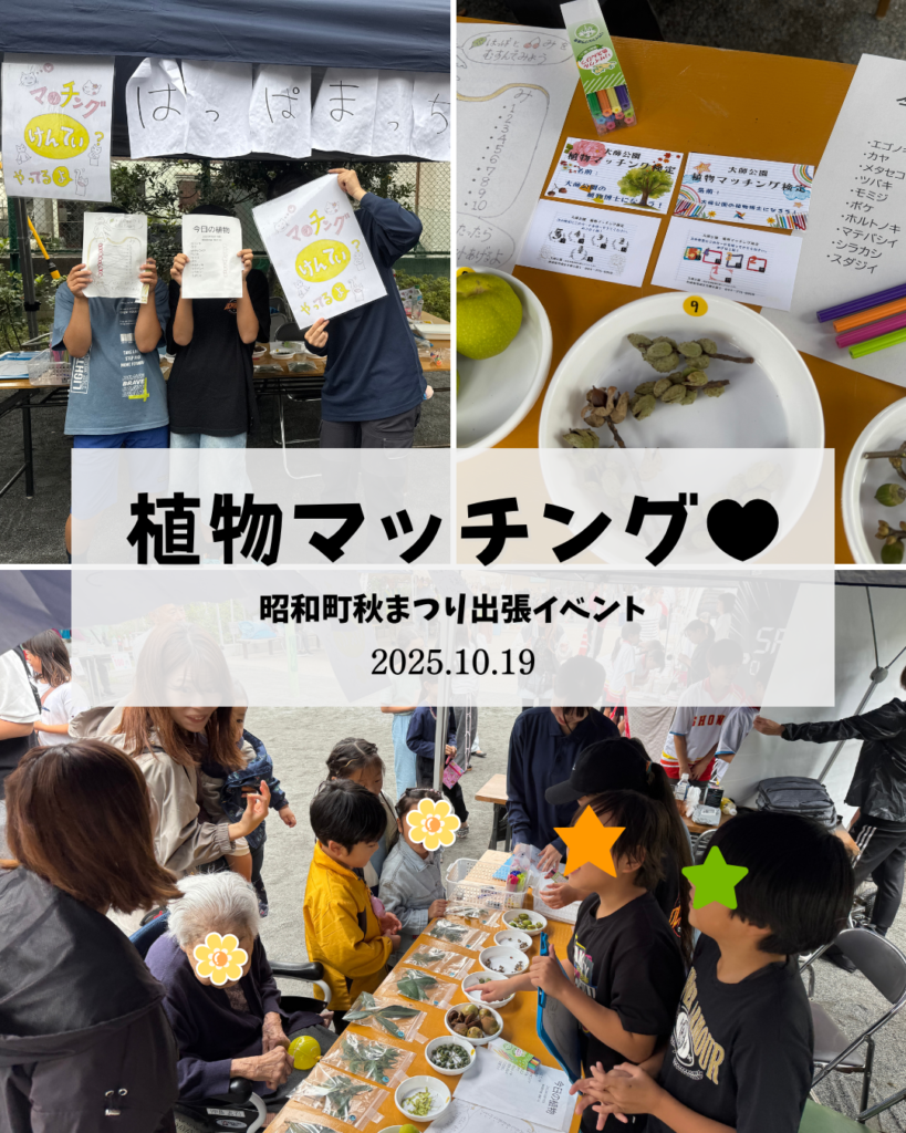 【イベントレポ・出張!昭和町秋まつり】R7.10月19日 2025/11/16 お知らせ大師日記おわったイベント 初めて参加させていただきました!そして初めての企画「植物マッチング♥」大師公園内の植物の「葉っぱ」と「実や花」を組み合わせるゲームです。スタッフが盛り上がってしまい、相当な難問となってしまいましたが、なんと満点正解者5名!今後も継続していきますので、ぜひ高得点狙っていきましょう!