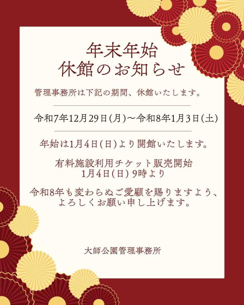 【年末年始 休館のお知らせ】 2025/12/29 お知らせ管理事務所 管理事務所は下記の期間、休館いたします。 令和7年12月29日(月)~令和8年1月3日(土) 年始は、令和7年1月4日(日)から通常通り開館いたします。 有料施設利用チケット販売:令和7年12月28日(日)17時15分まで販売開始:令和7年 1月4日(日)9時より 令和8年も変わらぬご愛顧を賜わりますよう、よろしくお願い申し上げます。 大師公園管理事務所