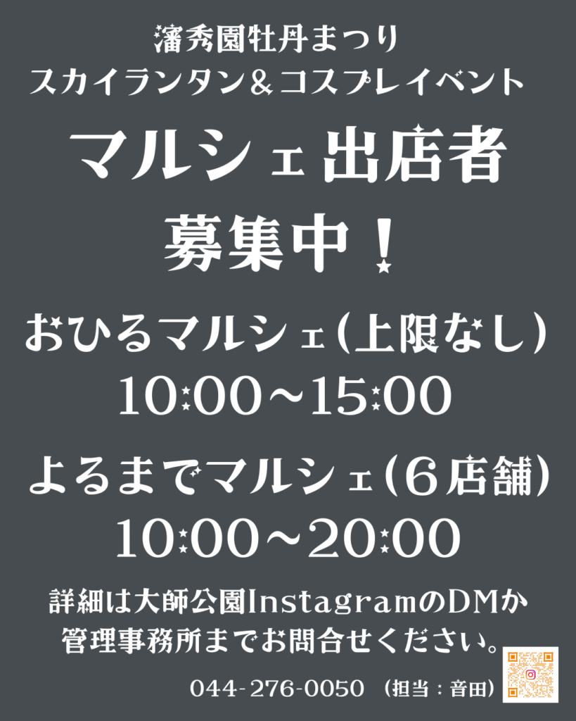 ◇雨天時は12日に延期します。12日も荒雨天の場合は中止とさせていただきます。ウェザーニュースの「川崎市川崎区大師公園」の天気予報にて前日12時に判断します。大師公園のホームページ及びInstagramアカウントにてお知らせしますので、必ずご確認ください。