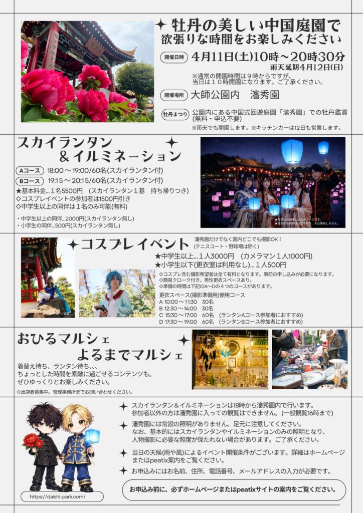 牡丹の咲く中国庭園、コスプレ撮影、魅力的なマルシェ、スカイランタンとイルミネーション。